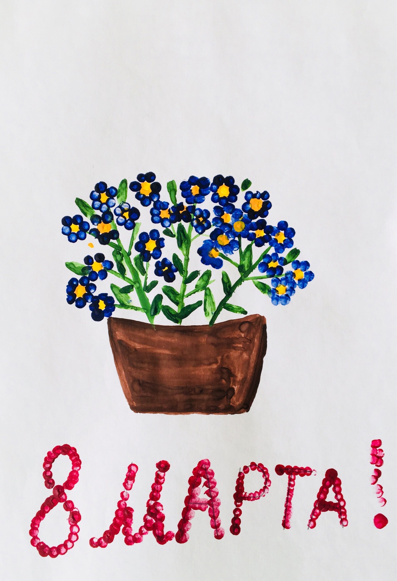 Рисование на тему :"8 Марта" . Оборудование: альбом для рисования, кисть, гуашь, банка для воды, ватные палочки.