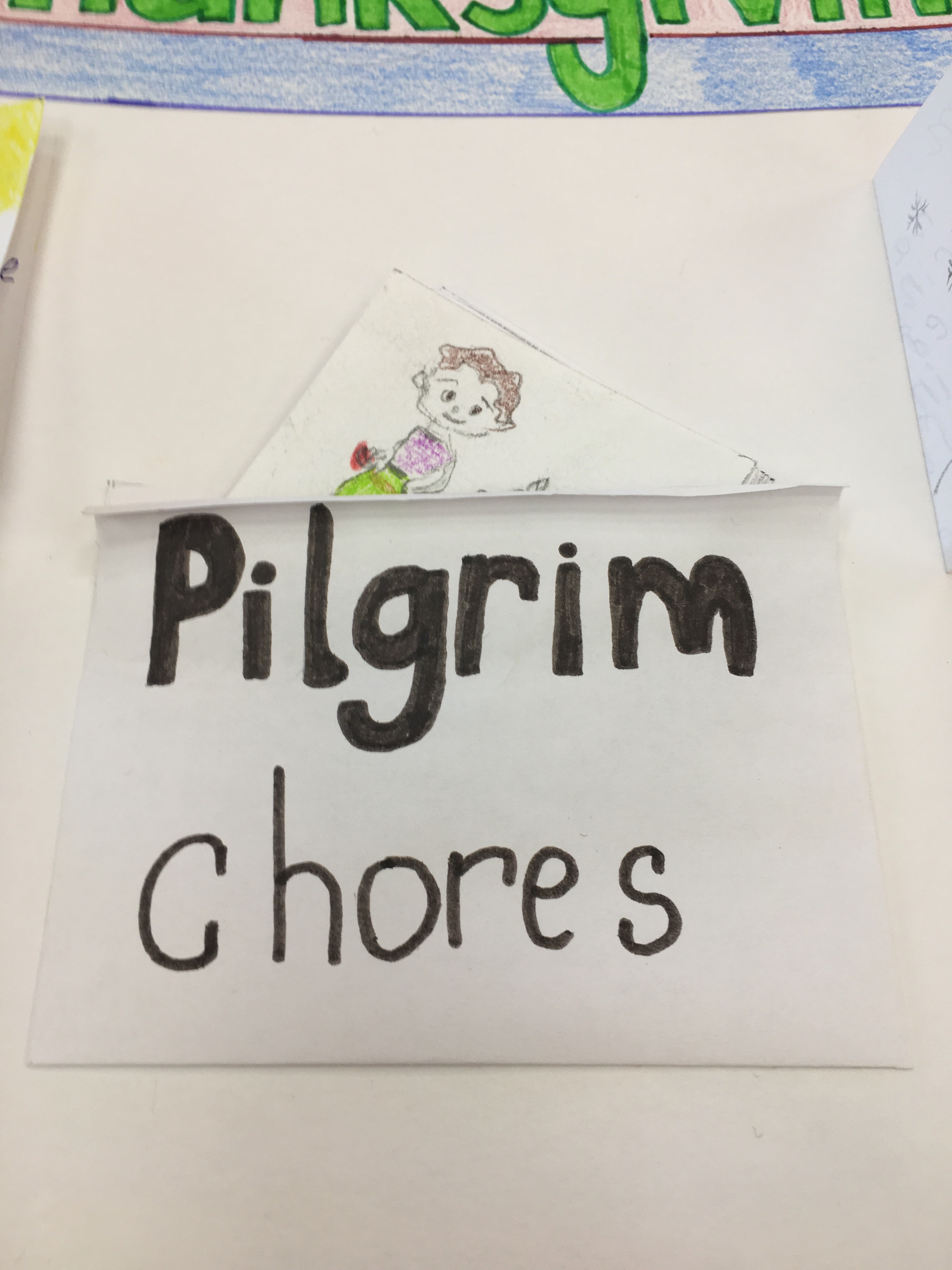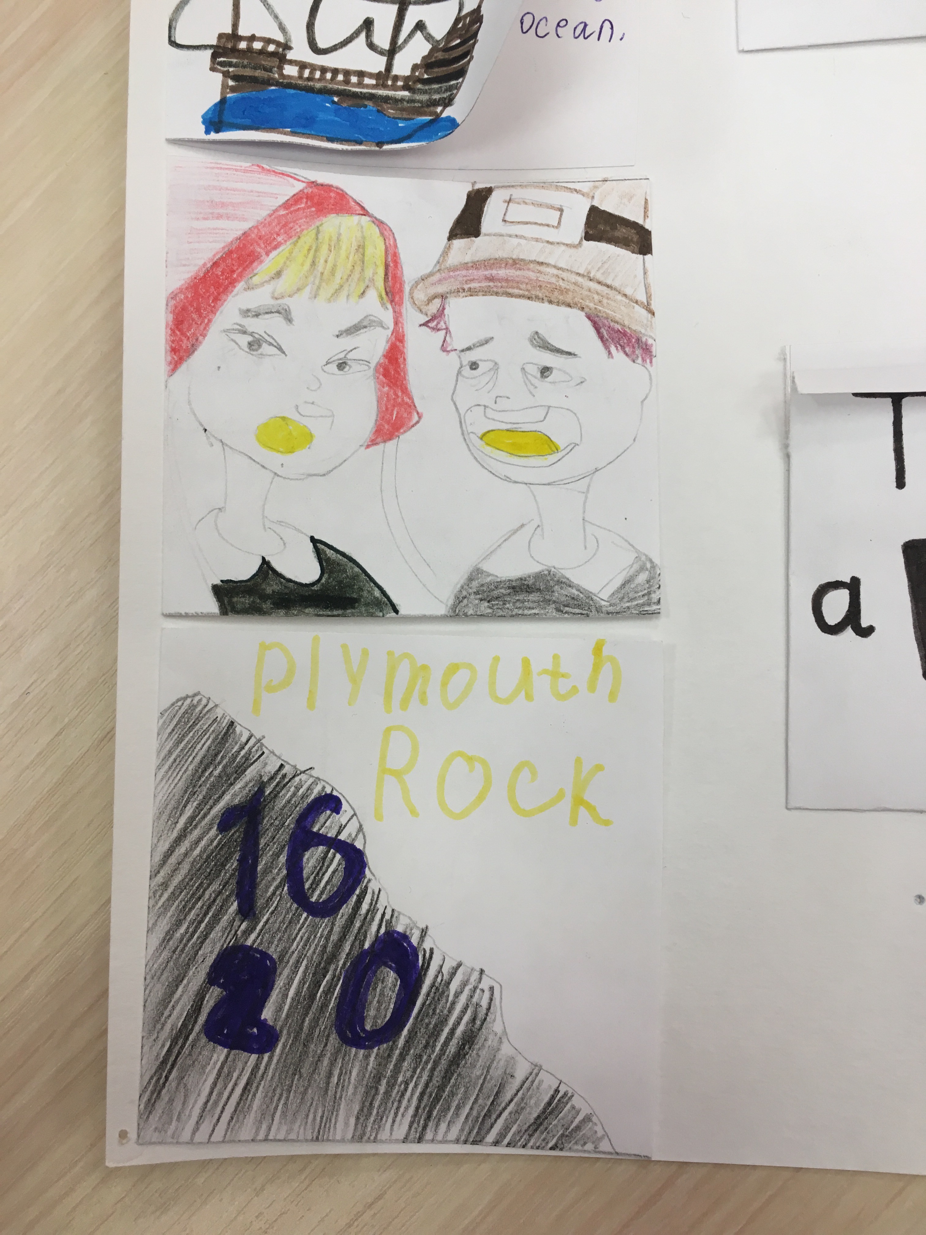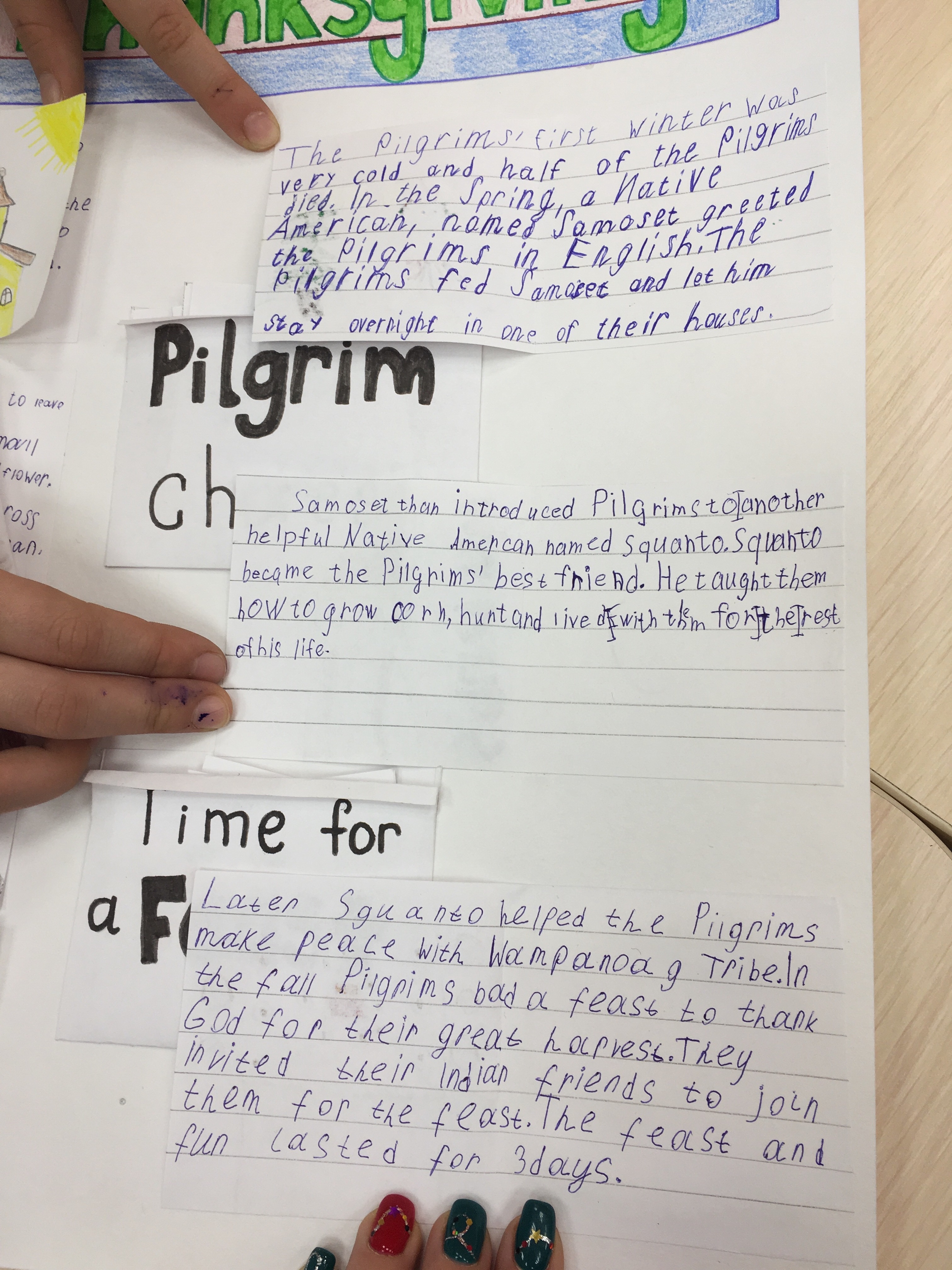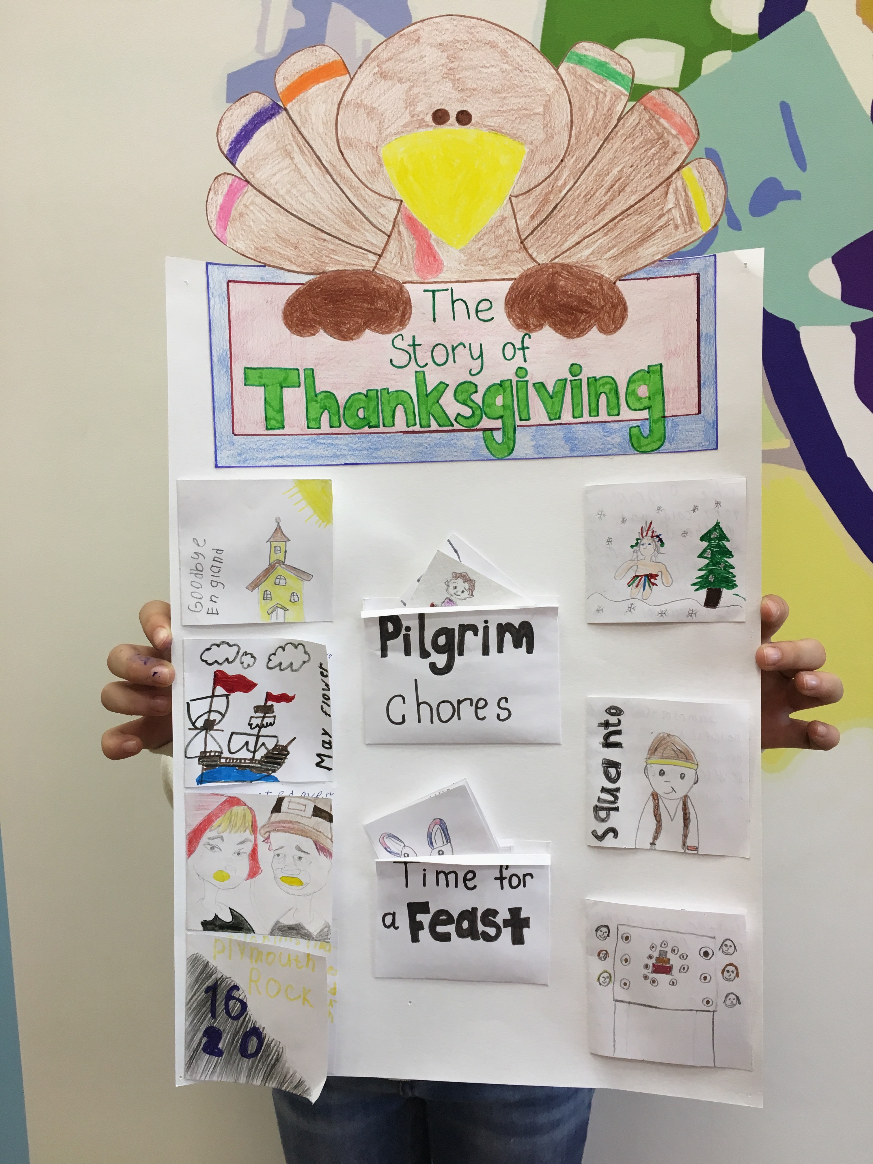 Данный коллаж был создан за неделю до празднования Дня благодарения, чтобы познакомить детей ближе с историей празднования. Ребятами были созданы небольшие карточки с рисунками и с краткой историей переселенцев. История включает в себя: причину переселения, жизнь на корабле, название корабля и их новой общины, имена индейцев и их племя, а также заботы пилигримов на новой земле и еду, которая была на столе во время первого пиршества.