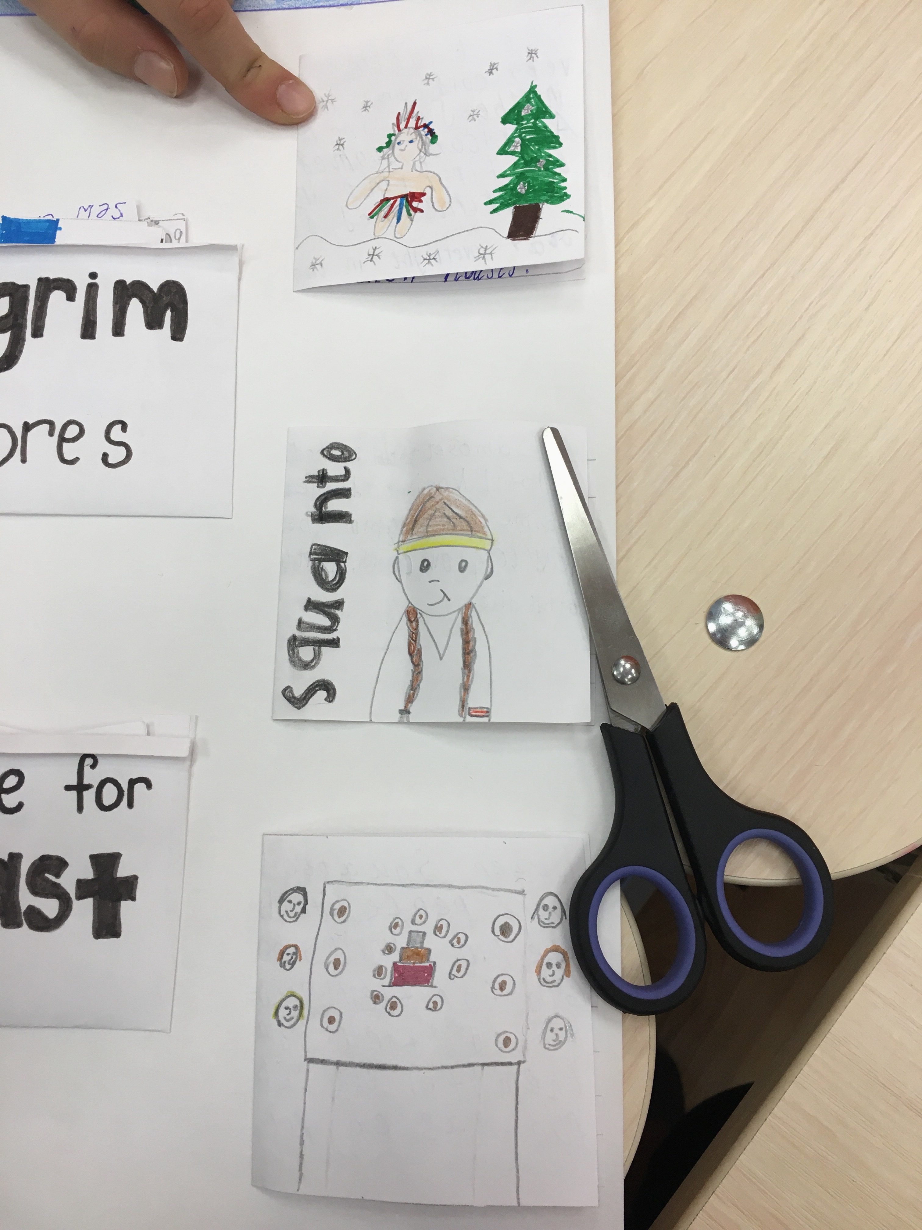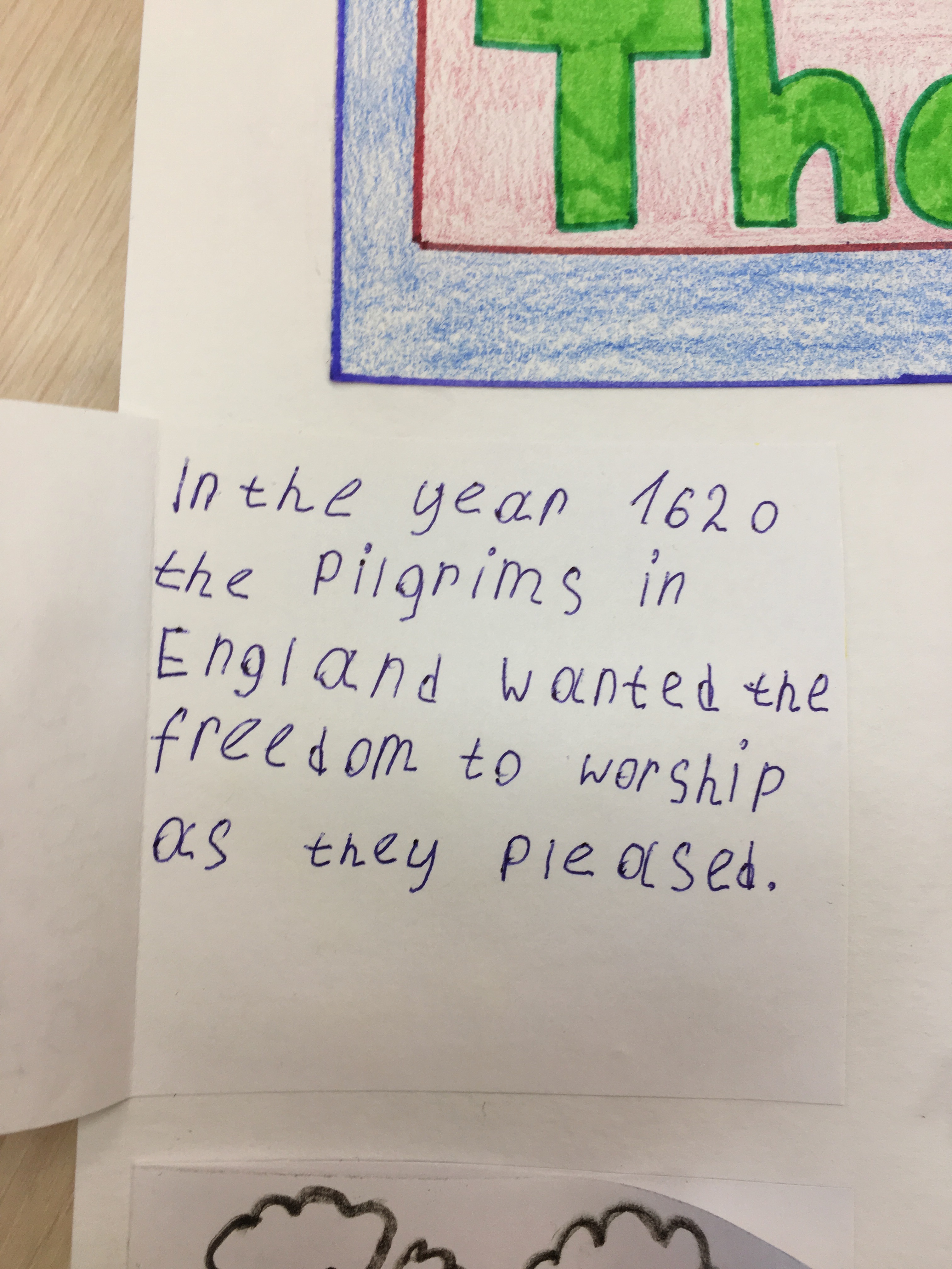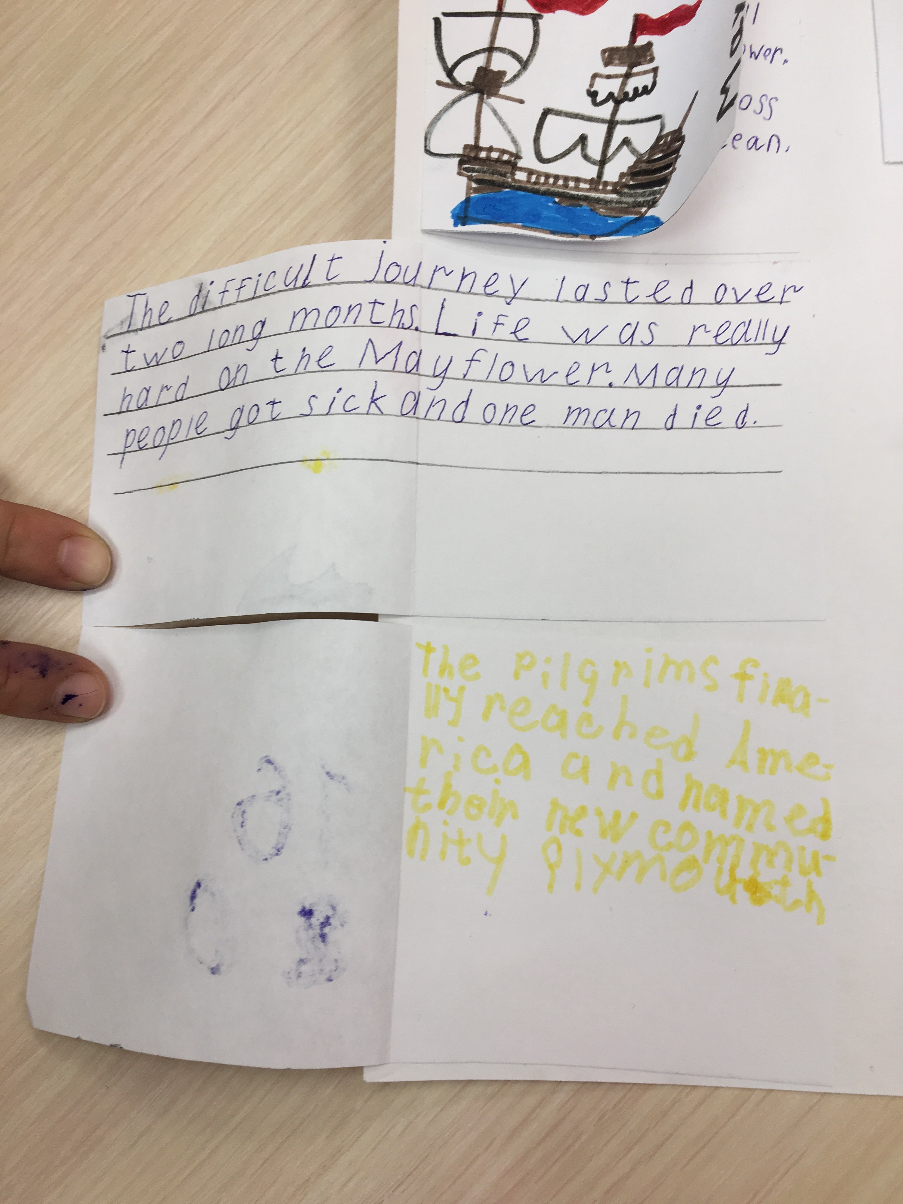 Данный коллаж был создан за неделю до празднования Дня благодарения, чтобы познакомить детей ближе с историей празднования. Ребятами были созданы небольшие карточки с рисунками и с краткой историей переселенцев. История включает в себя: причину переселения, жизнь на корабле, название корабля и их новой общины, имена индейцев и их племя, а также заботы пилигримов на новой земле и еду, которая была на столе во время первого пиршества.