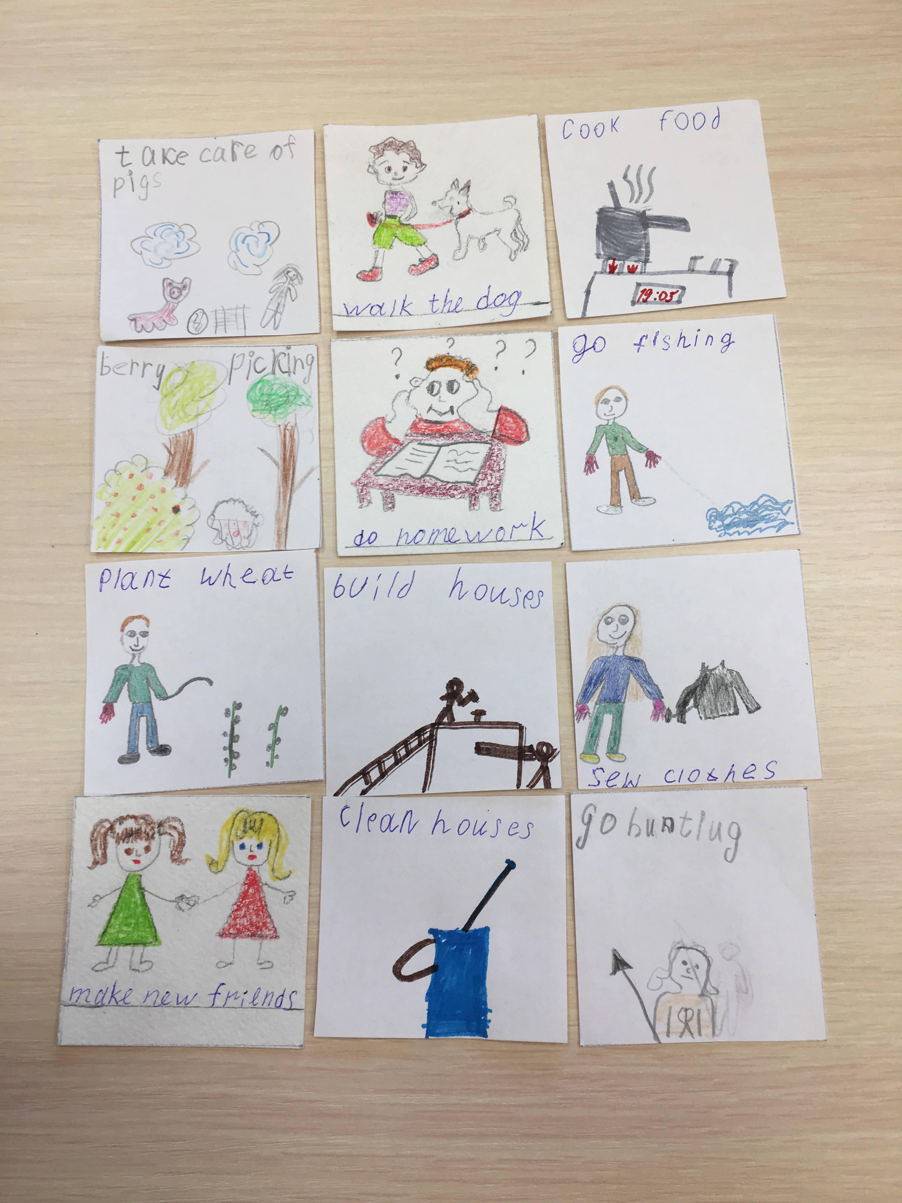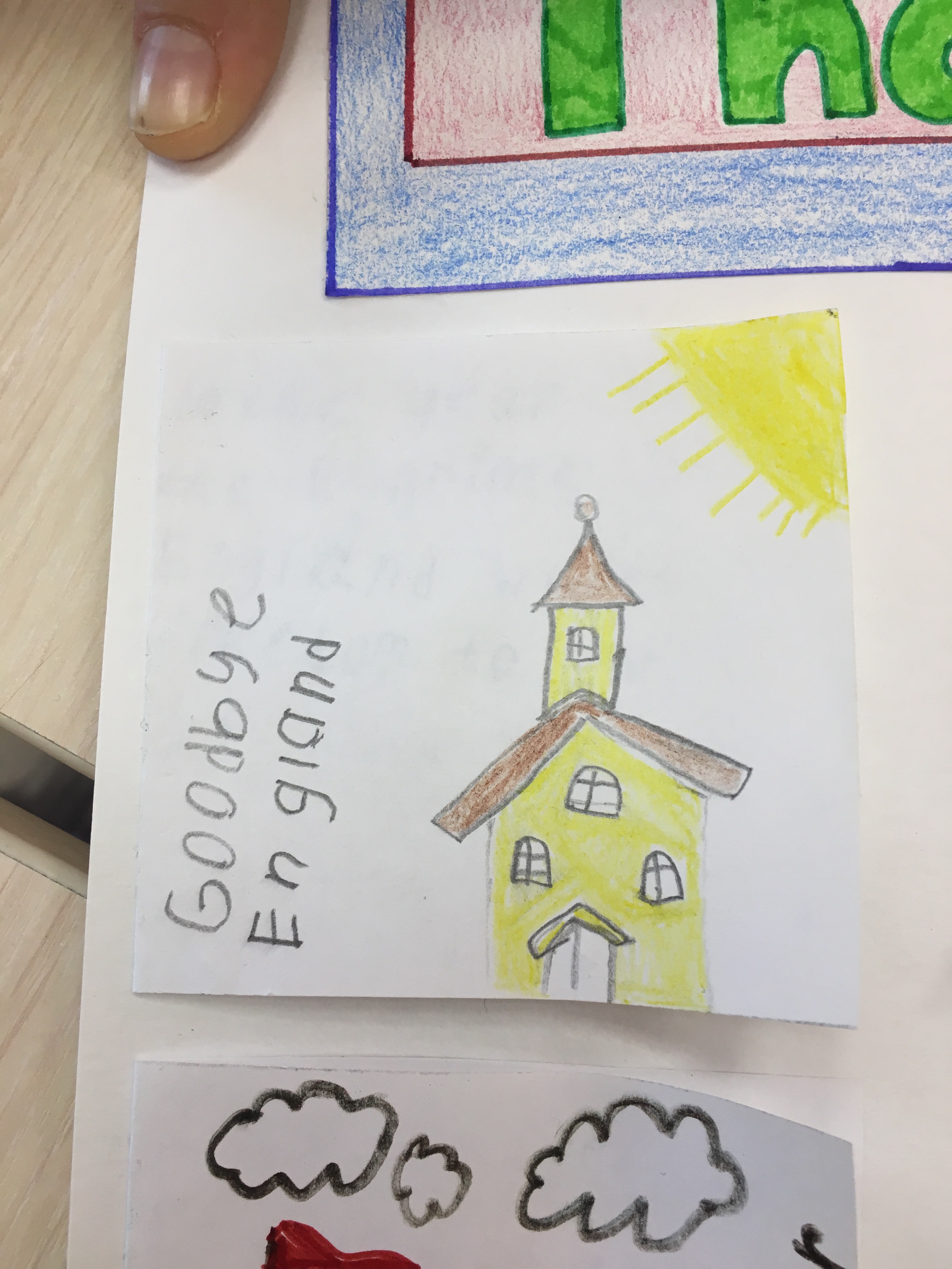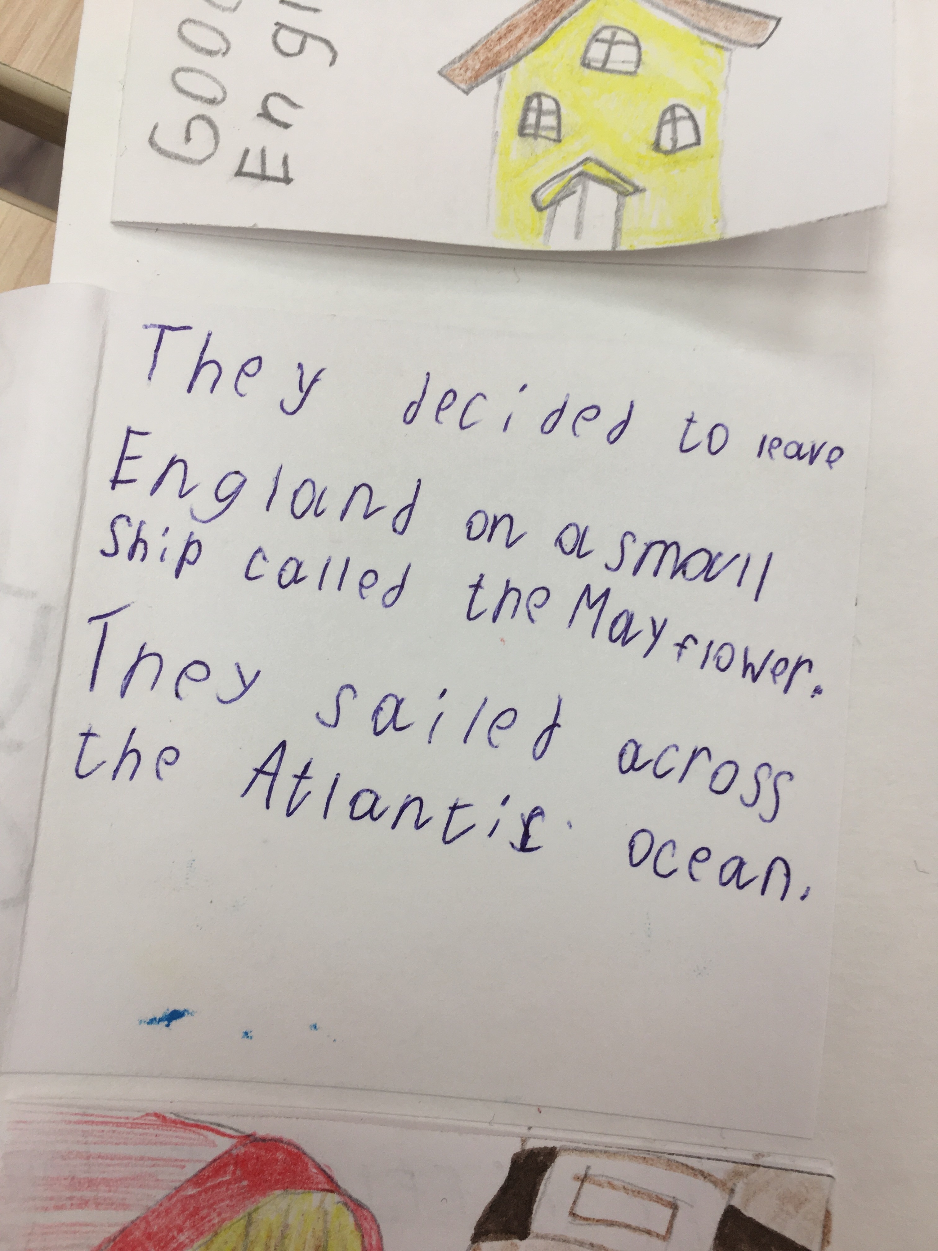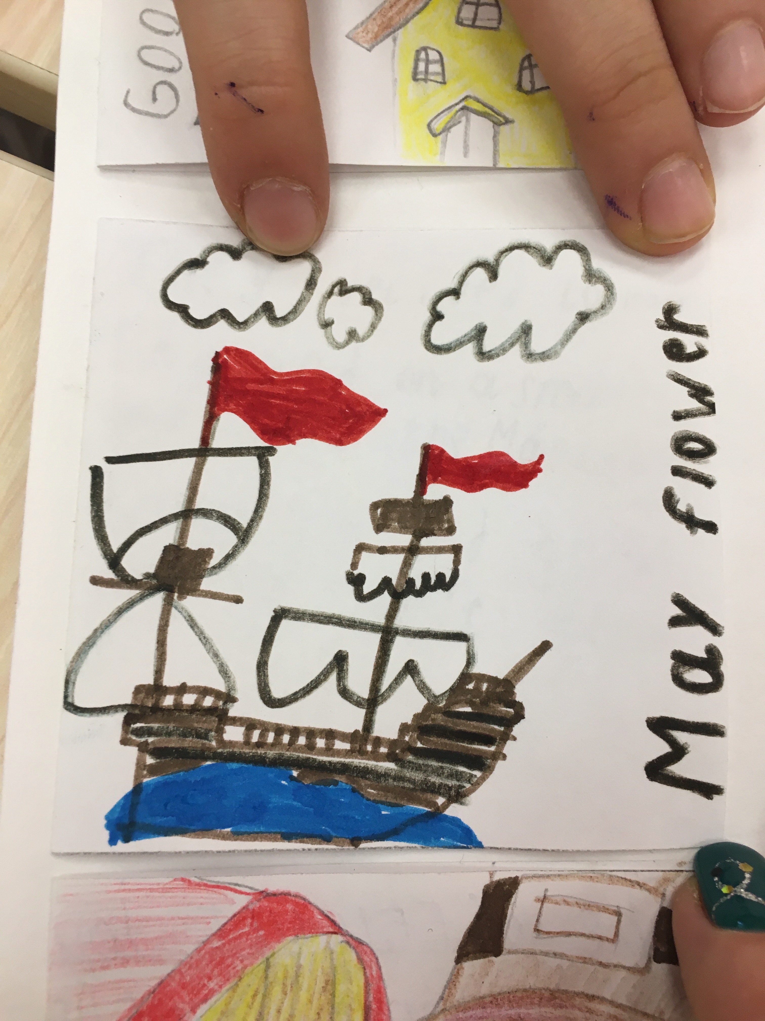 Данный коллаж был создан за неделю до празднования Дня благодарения, чтобы познакомить детей ближе с историей празднования. Ребятами были созданы небольшие карточки с рисунками и с краткой историей переселенцев. История включает в себя: причину переселения, жизнь на корабле, название корабля и их новой общины, имена индейцев и их племя, а также заботы пилигримов на новой земле и еду, которая была на столе во время первого пиршества.