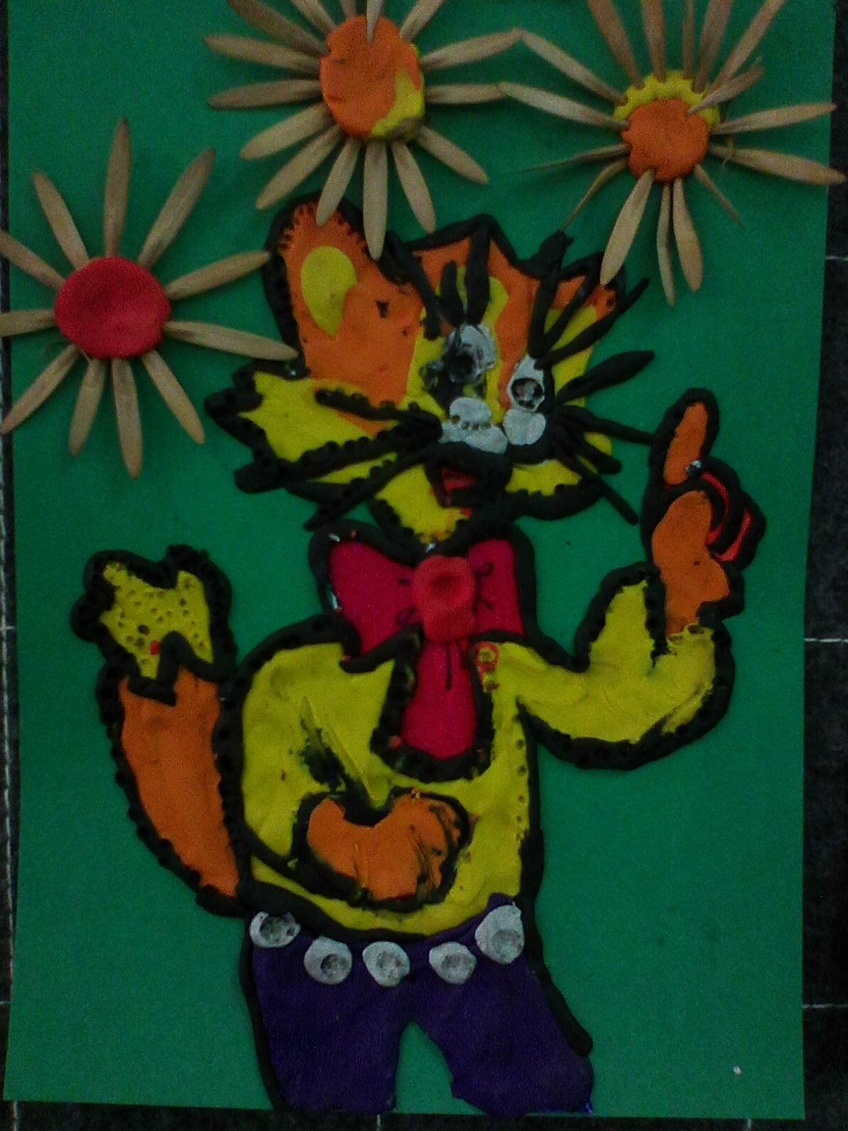 Ребенок готовил поделку из пластилина и природного материала для мамы