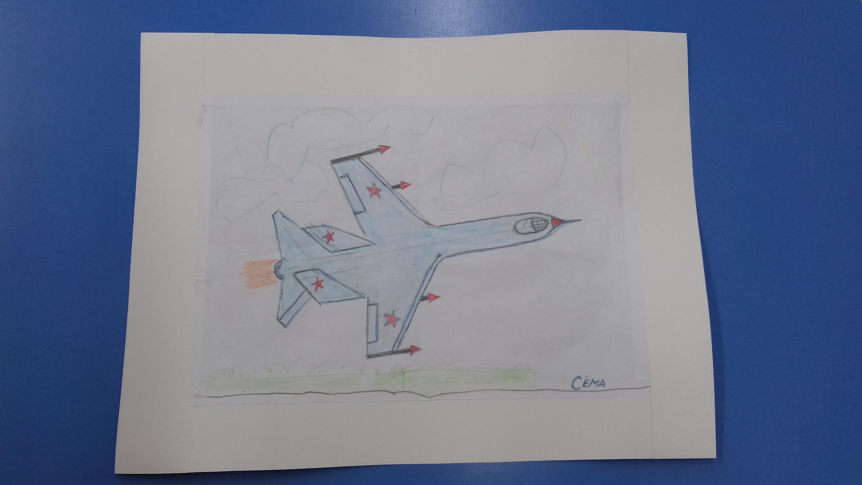 Работа выполнена цветными карандашами. Модель военного самолета ВВС России.