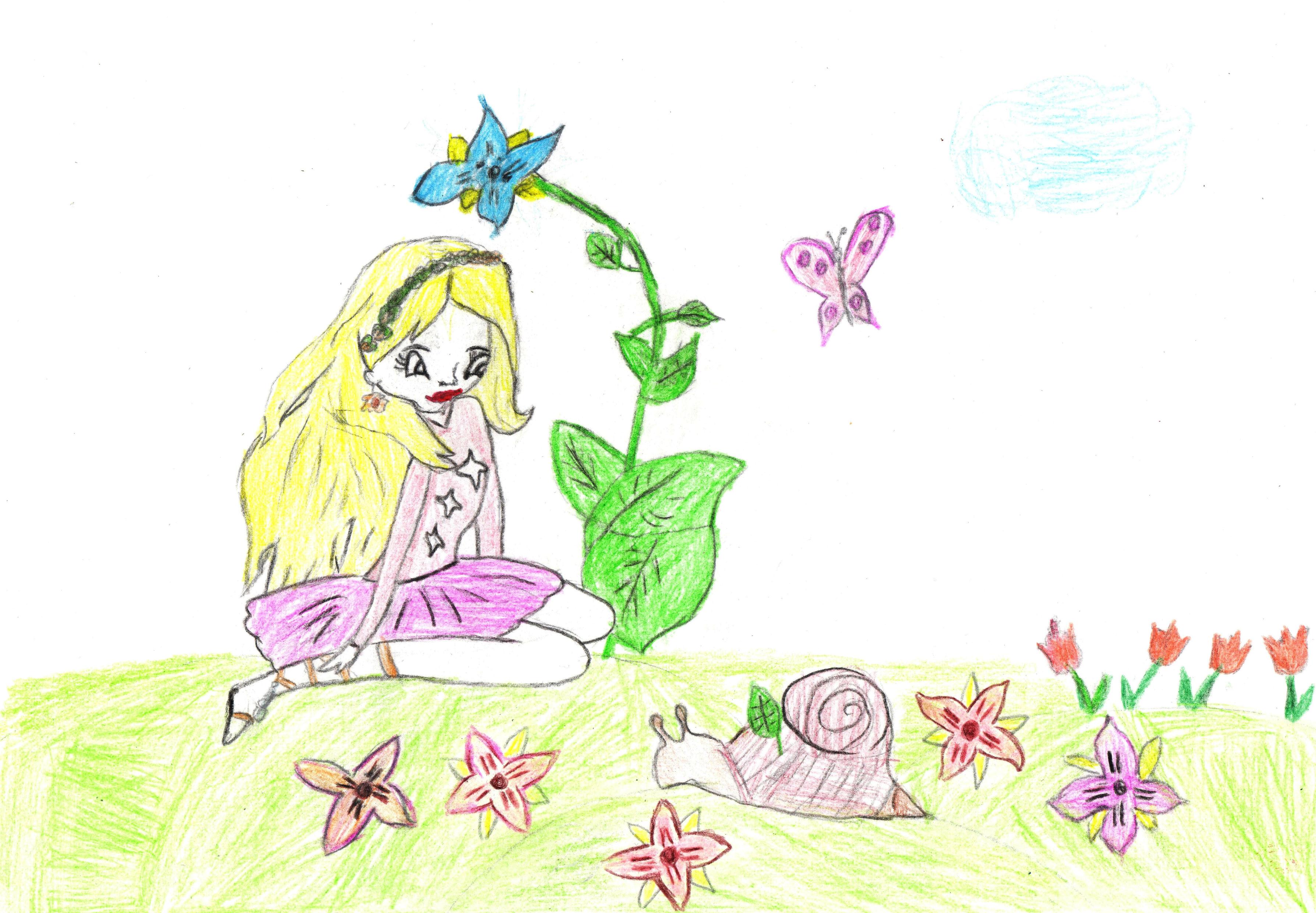 Что вокруг меня? Кто это? Как возникла эта красота: цветы, бабочки, улитка? Широко открытыми глазами девочка вглядывается в окружающий ее мир природы.