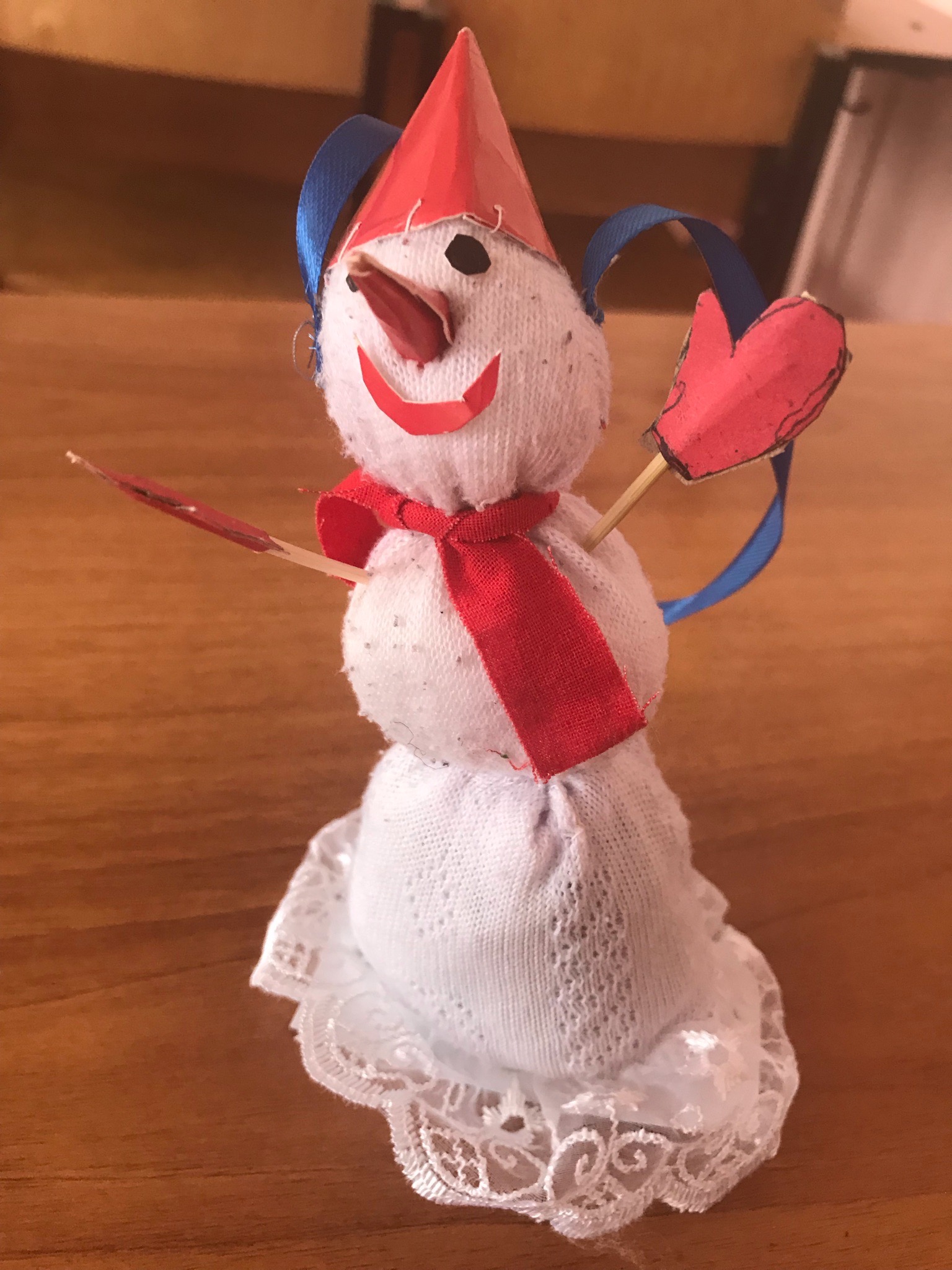 Поделка "Новогоднее чудо" из ткани и кружева, с использованием цветного картона и шпажек.