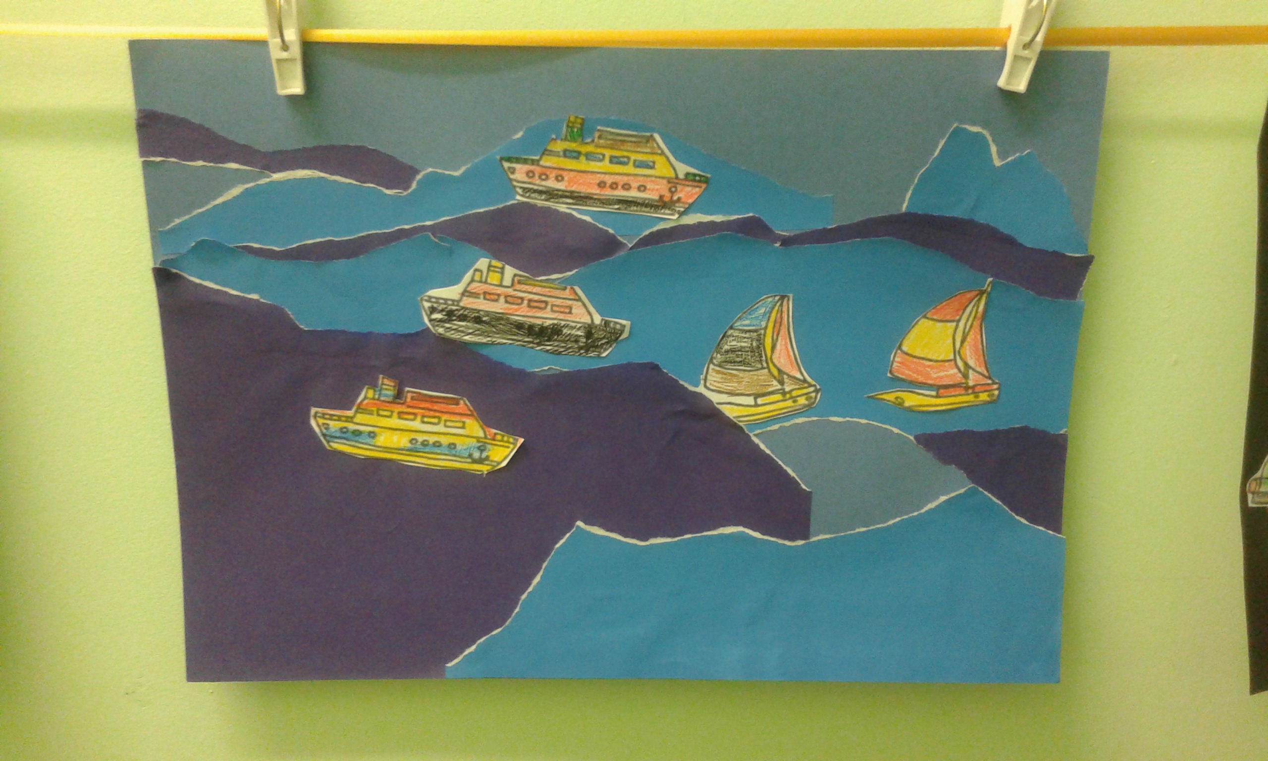 Коллективная работа "Виды транспорта: наземный, водный, воздушный" выполнена детьми старшего дошкольного возраста в смешанной технике: аппликация с элементами рисования.