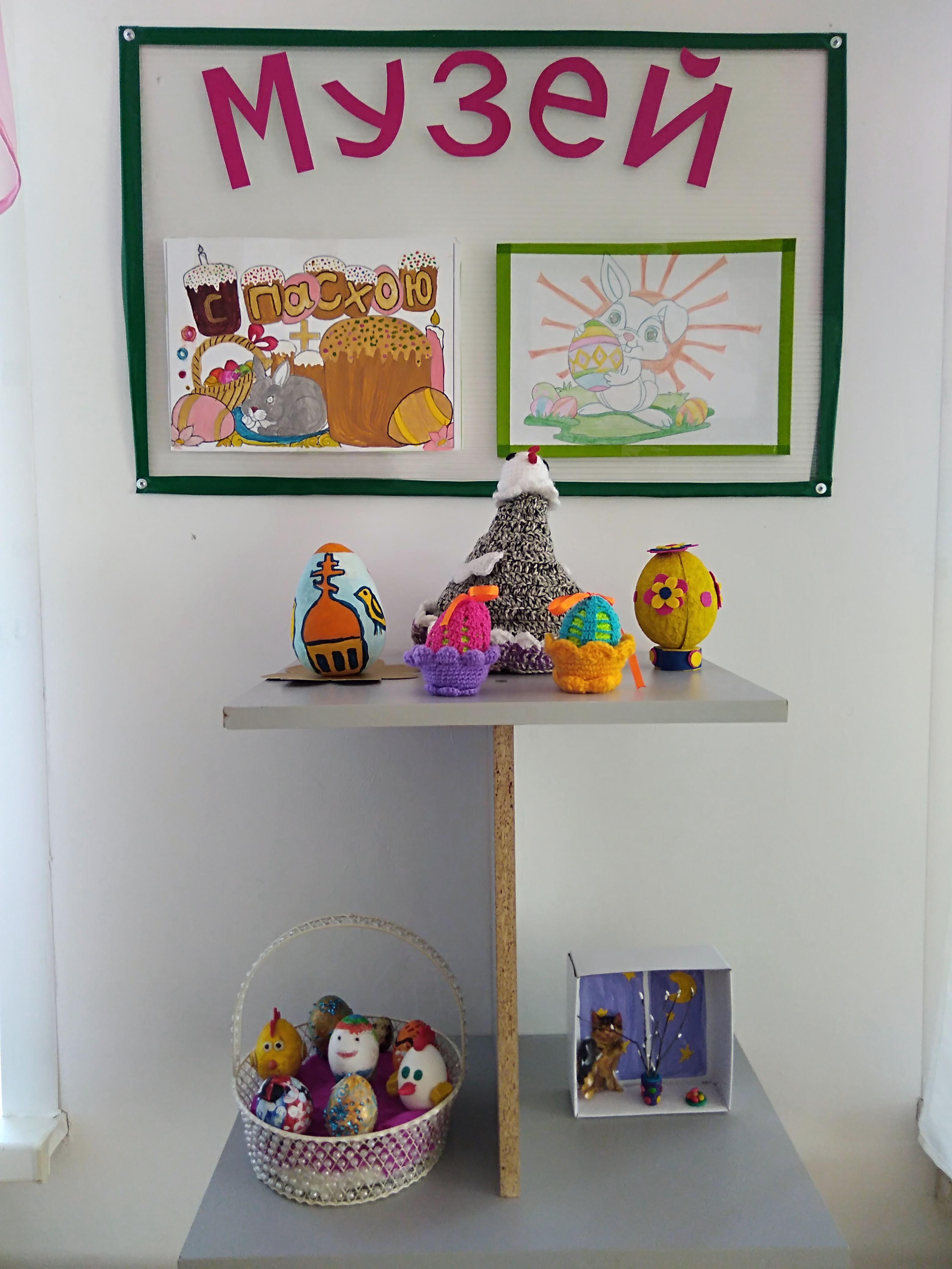 1. Поделка "Курочка с яйцами"Вязание спицами. 2. Корзиночка с окрашенными яйцами (гуашь). 3. Поделка "Верба на окне". Бросовый материал, пластилин, цветные наклейки. Раскрашена гуашью. 4. Поделки "Пасхальные яйца", украшенные бусинками, наклейками, пластилином. 5. Аппликация и рисунок на тему "Пасха"