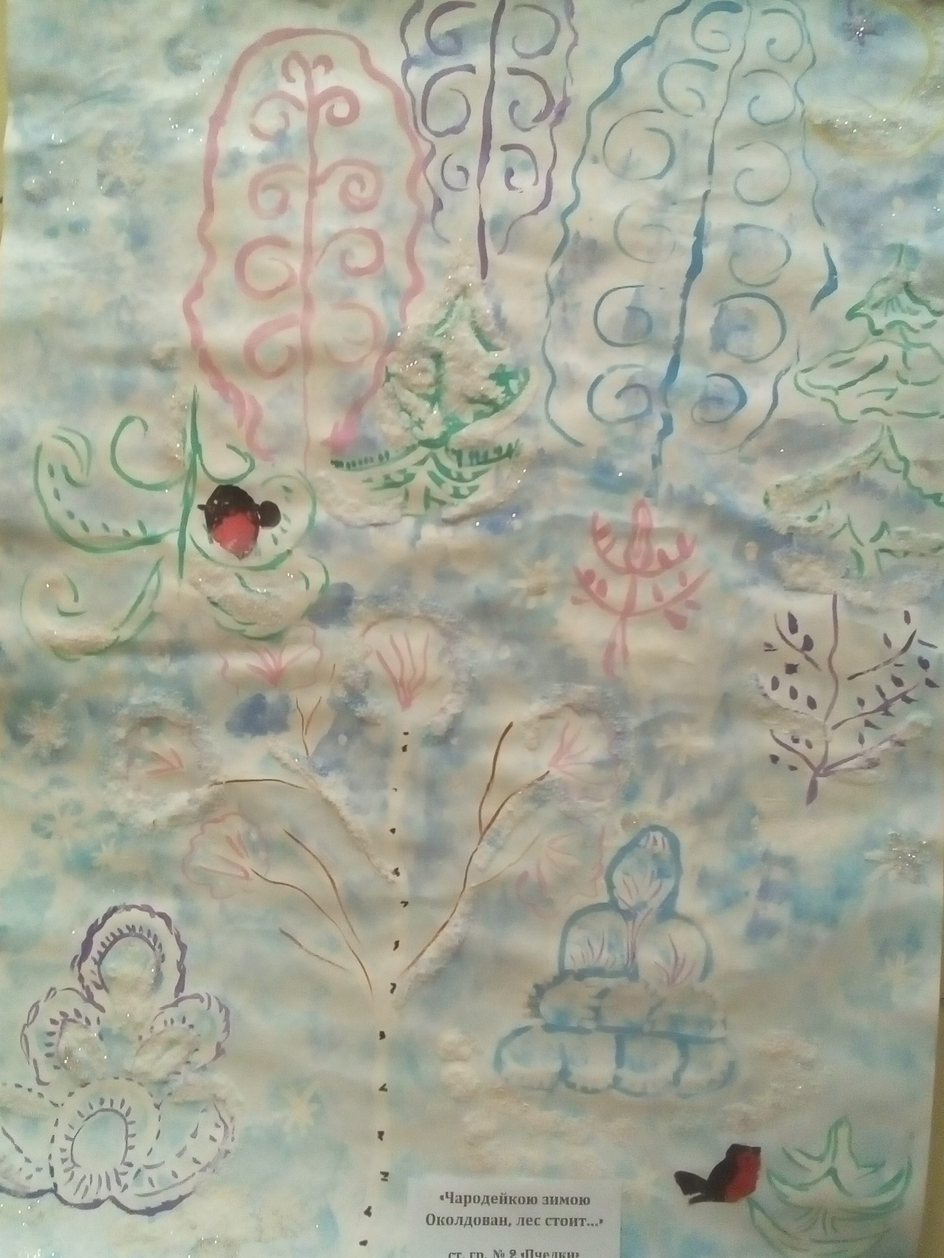 Работа, созданная детьми старшей группы по теме: "Зимний лес"