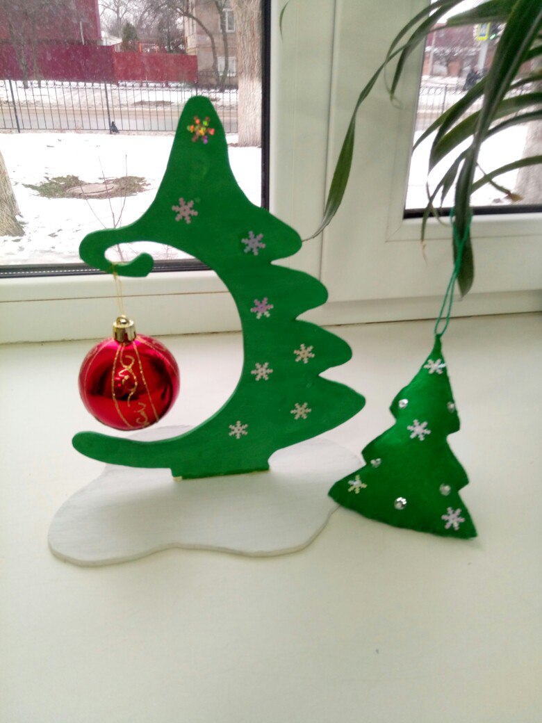 представлены работы по художественной обработке фанеры (елочка выпилена ручным лобзиком и раскрашена гуашью) и мягкая игрушка "Елочка"