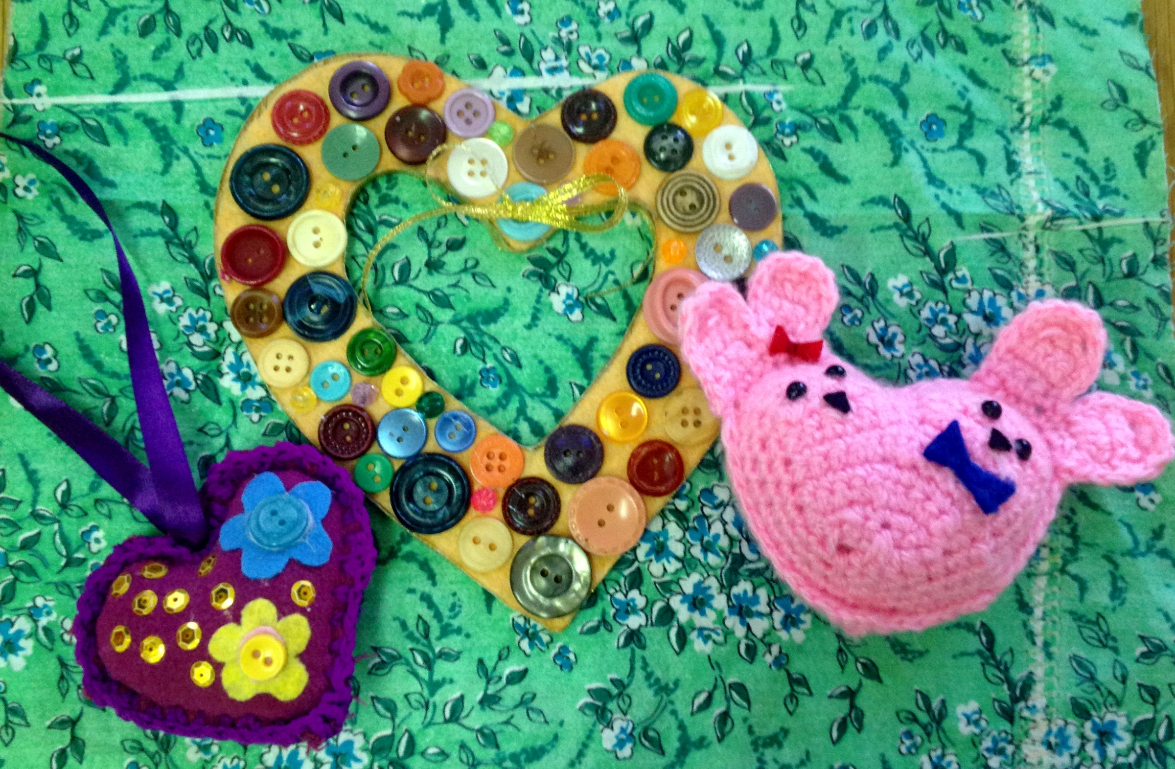 Поделка сделана из фанеры, оформлена фетром, пуговицами, вязанное сердце в форме зайцев и сердце, сделанное их фетра, обвязано крючком.