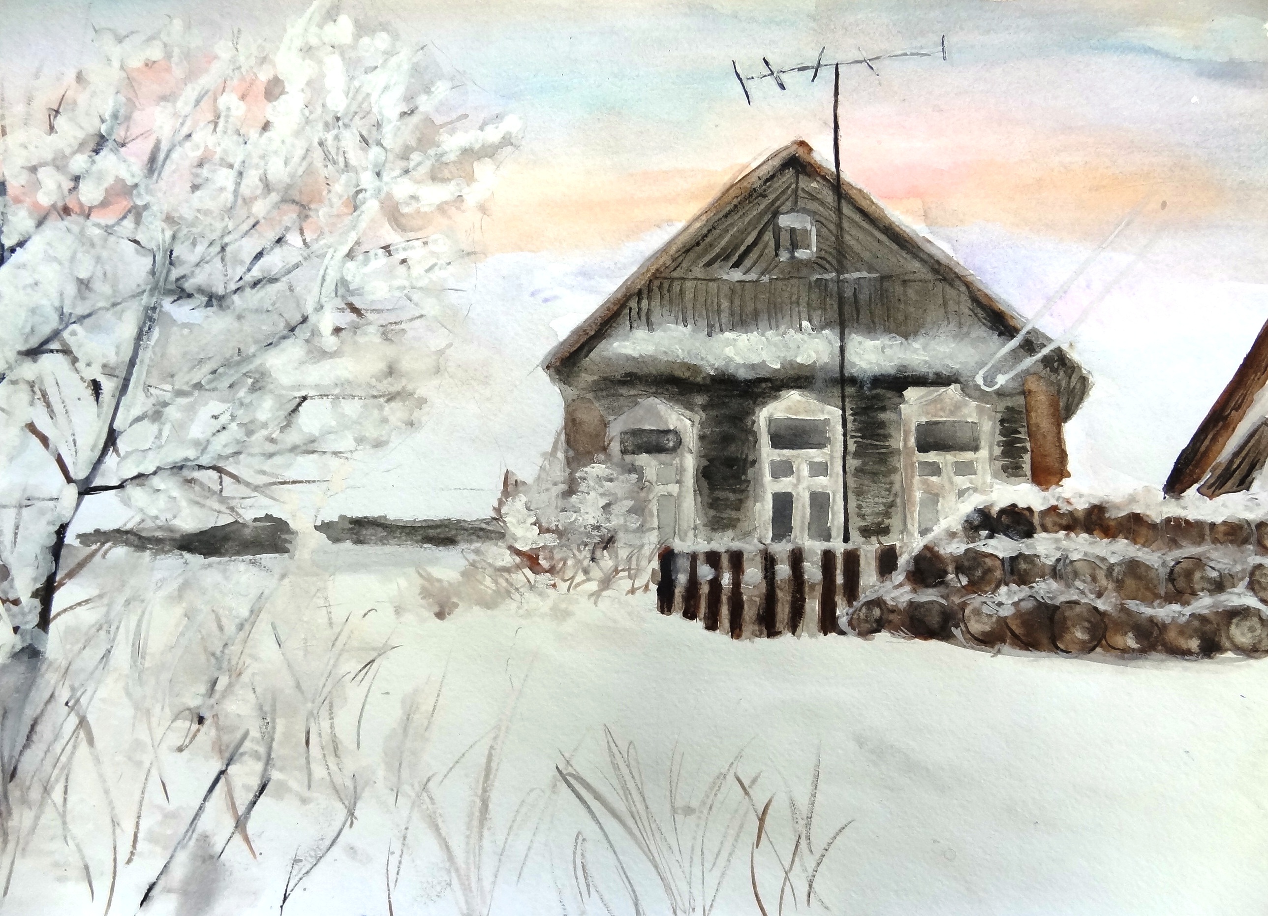 Рисунок "Деревенька моя". Акварель. д. Мишково Селижаровского района Тверской области. Автор - Иванова Елизавета Александровна, учащаяся 7 класса МОУ Шуваевской ООШ.